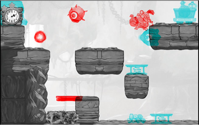 A screenshot of ‘Dig Rush’. The amblyopic eye can only see high-contrast red, the normal eye only sees low-contrast blue whilst both eyes see grey background elements. Credit: Retina Foundation of the Southwest.